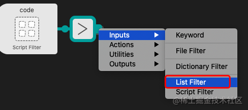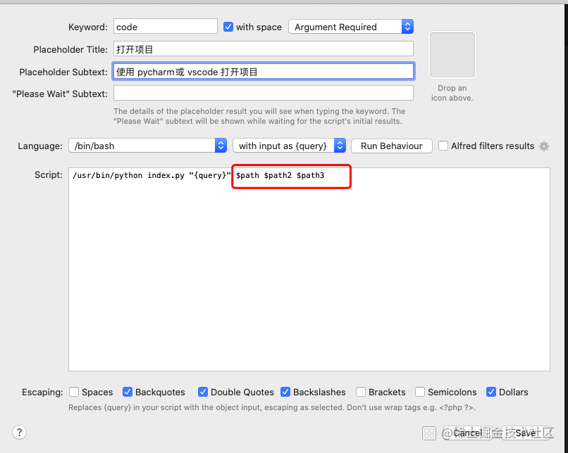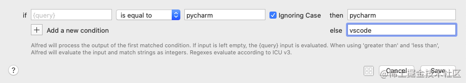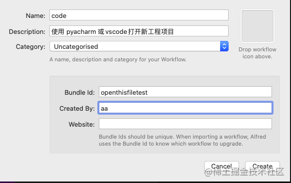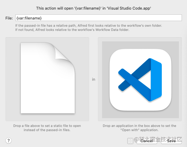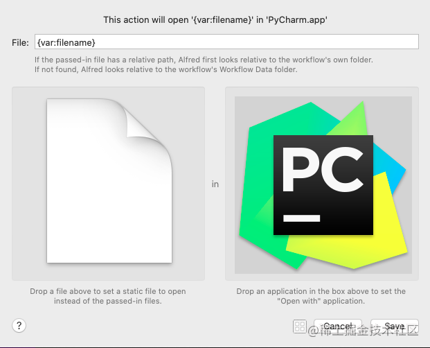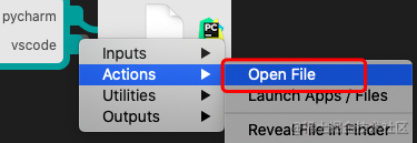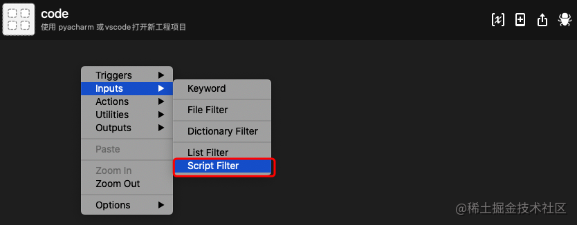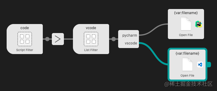 上图是 Alfred 的工作流程示意图,我们通过使用 code 命令根据项目目录选择 pycharm 或 vscode 打开项目文件夹,这一例子来看一下 Alfred 的工作流程。