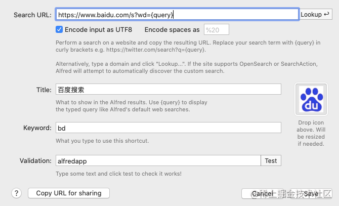 以自定义百度为搜索引擎为例,如果我们要让 bd 作为百度搜索引擎的关键词,那我们可以进行如下配置:
