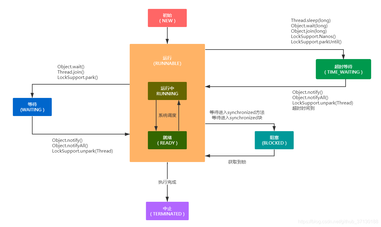 | RUNNABLE | 运行状态,Java系统中将操作系统中的就绪和运行两种状态笼统地称为“运行中” |