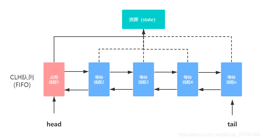 CLH解释:(Craig,Landin,and Hagersten locks)是一种基于链表的可扩展、高性能、公平的自旋锁,申请线程只在本地变量上自旋,它不断轮询前驱的状态,如果发现前驱的释放了锁就结束自旋。