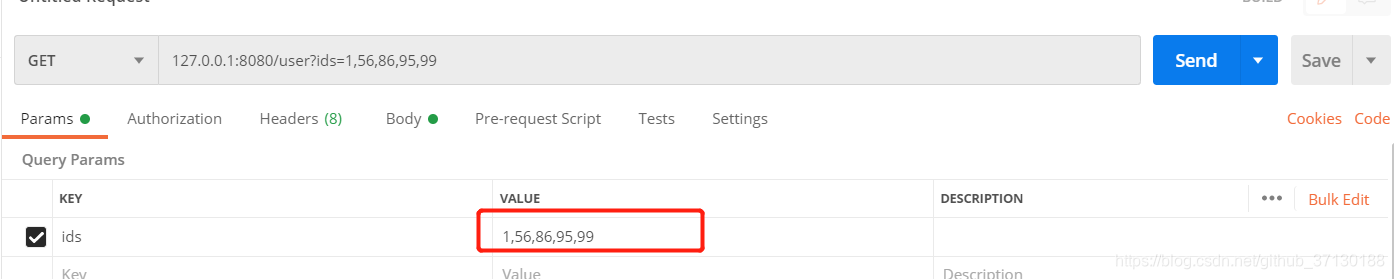 但我们在调试的时候,使用postman不知道怎么传递一个Integer类型集合。我们可以在指定的参数,像往常一样传递多个值,只是值与值之间用“,”隔开,这样就可以达到传入Integer集合的效果。