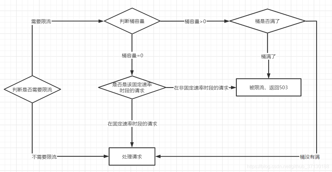 如果没有配置桶容量(burst=0),按照固定速率处理请求。如果请求被限流了,直接返回503;