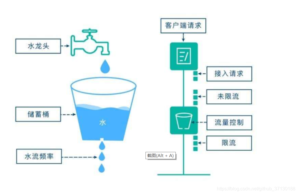 (1)漏桶算法:漏桶(Leaky Bucket)算法思路很简单,水(请求)先进入到漏桶里,漏桶以一定的速度出水(接口有响应速率),当水流入速度过大会直接溢出(访问频率超过接口响应速率),然后就拒绝请求,可以看出漏桶算法能强行限制数据的传输速率。