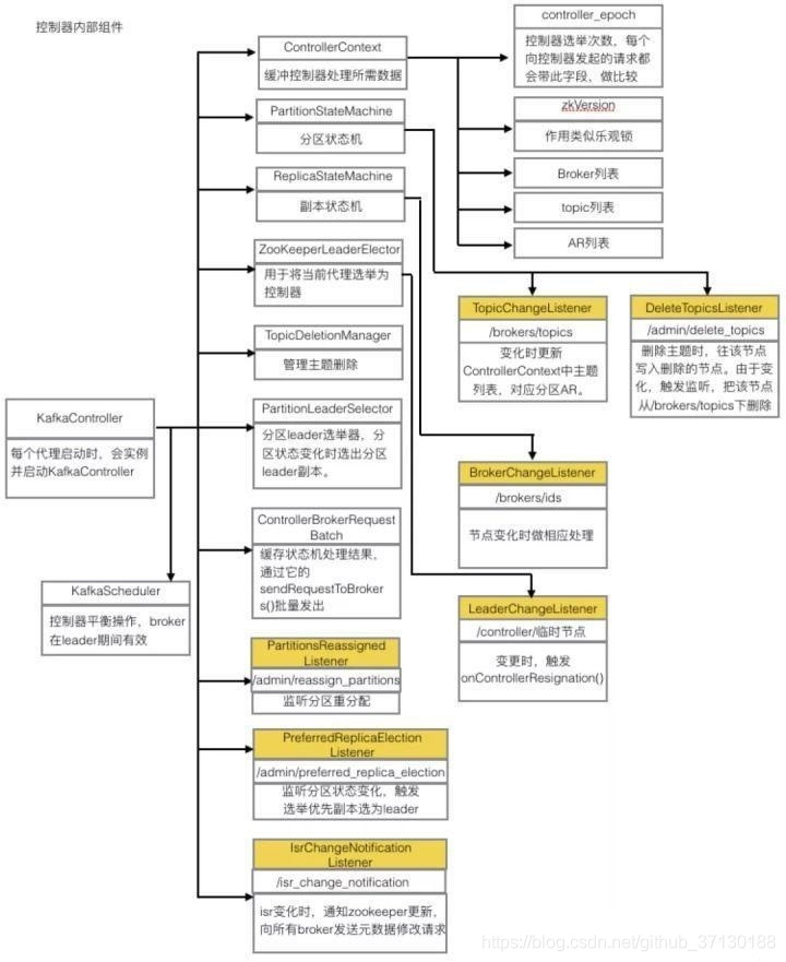 前面提到过每个broker都会实例化并启动一个KafkaController。KafkaController和他的组件关系,以及各个组件的介绍如下图: