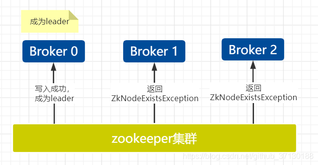 (四)假设broker 0的速度最快,他先写入了/controller节点,那么他就成为了leader。而broker1、broker2很不幸,因为晚了一步,他们在写/controller的过程中会抛出ZkNodeExistsException,也就是zk告诉他们,此节点已经存在了。