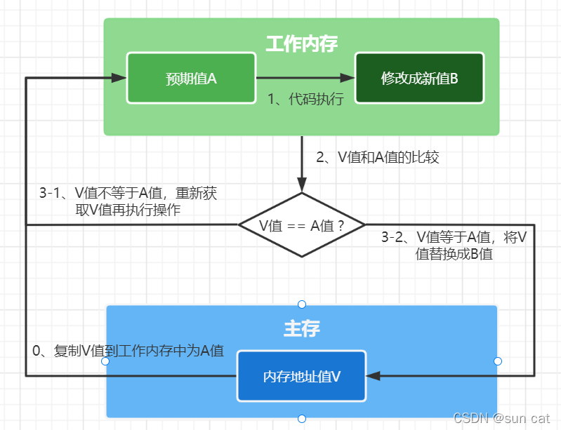 更新一个变量的时候,只有当变量的预期值A和内存地址V值相同时,才会将内存地址V对应的值修改为B。