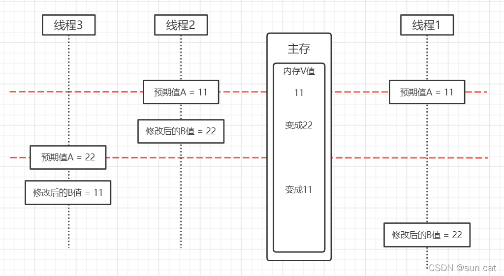 线程2以及线程3都正确的执行了,但是线程1由于某种原因阻塞,导致其完成时间比较久。在线程1阻塞过程中,内存值从11变成22,再由22变回11。