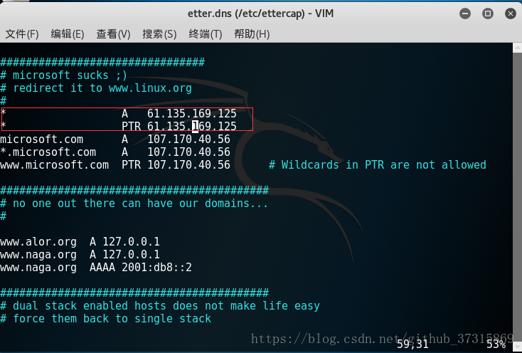 通过 i 键进入编辑状态,然后在红色的矩形中输入,前面的*所在的位置代表需要访问的网站的域名,后面是将其欺骗到的ip,