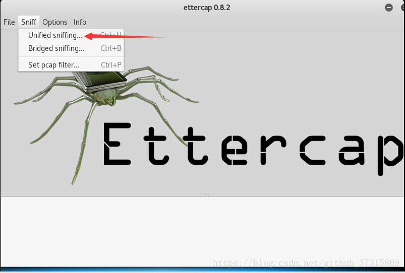 首先通过命令行模式打开图形界面,选择Unified sniffing以中间人的方式进行嗅探