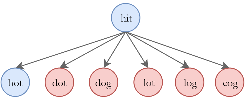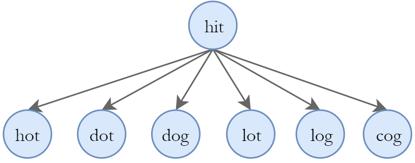 但是,根据题目要求hit的下一步不能是dot、dog、lot、log以及cog,因为题目要求一次只能转换一个字符,因此从hit开始的下一步只能是hot,如图所示: