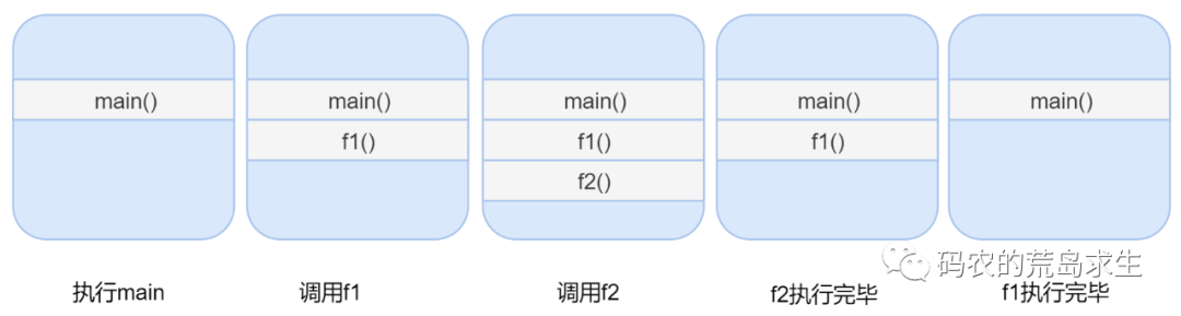 这个过程中我们还会发现一个很有意思的现象就是最先被使用的栈帧其实是最后才被释放的,这种先进后出的性质就被称之为“栈”,如下图所示。所以你会看到“栈“这个词更多的是指顺序上的先进后出,只不过函数调用时所占用的内存在使用方式上也是先进后出的,所以这块内存就被称之为栈区了。