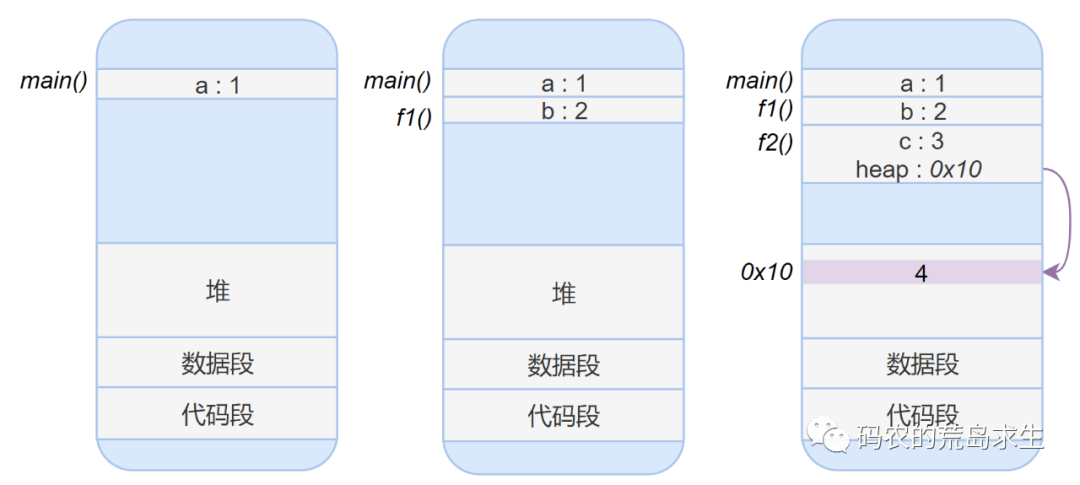 这段代码中,main函数会调用函数f1,f1会调用函数f2(),其中变量a,b,c以及heap依次被放在各自函数的栈帧中,值得注意的一点在于,heap这个变量本身是在栈上的,但是heap所指向的内存是分配在堆上的,heap本身仅仅保存的是4这个值在内存中的位置,比如这里的0x10,表示的就是4这个值放在了内存0x10的这个位置上,heap就是C/C++语言中所谓的指针。如图所示: