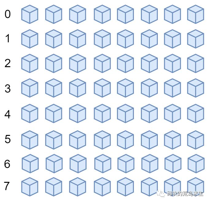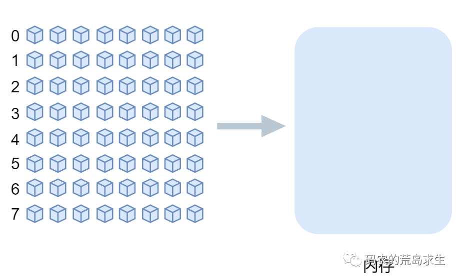 内存由一大堆的“盒子”组成,每个盒子中要么是0要么是1,其中8个盒子被称之为一个“字节”,每8个盒子也就是一个字节都有一个编号,这些编号就是简单的从0开始依次累加的,这个编号就被称之为“内存地址”。如图所示,你可以把内存理解为下面这张图,其中左边的数字是内存地址,每一排是一个字节,图中展示的就是一个8字节大小的内存。