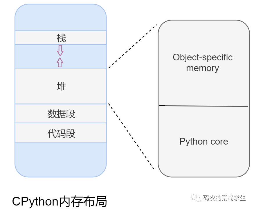 Python语言中的解释器比较多,比如CPython,PyPy等,在这里我们以Python默认的解释器CPython为例来说明,我们已经知道了解释器其实也是一个C程序,CPython也不例外,下图左侧就是我们已经熟悉的C/C++内存布局,我们把堆区放大,如下图右侧所示。我们可以看到Python的解释器把自己的堆区划分成了两部分,分别是Object-specific memory区域,以及Python core区域: