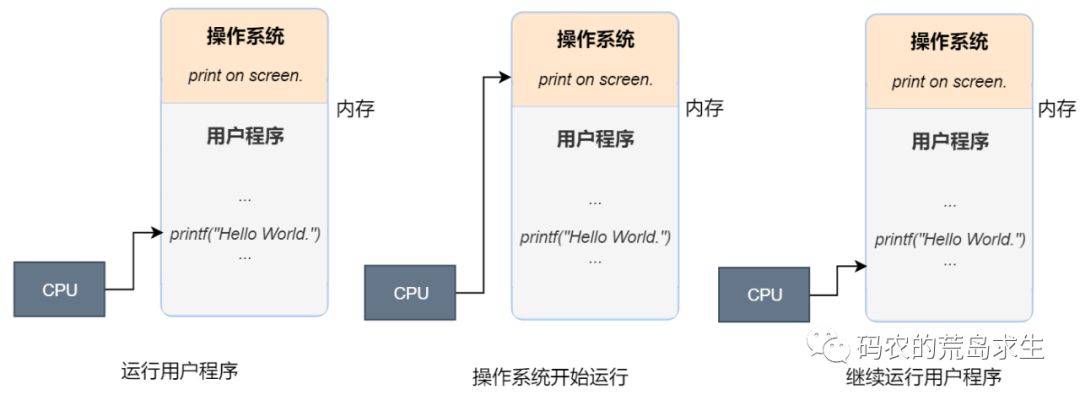 在这里,作为程序员你需要意识到,当你的程序在运行时,CPU不是一直在执行你的程序的,而是要时不时的跳转到操作系统,通过运行操作系统来完成程序中某些函数调用。至于哪些函数调用会需要操作系统的帮助,学完这章课程你就明白啦。