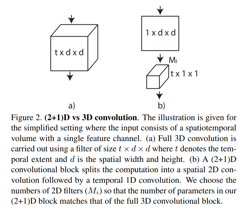 3在2的基础上,论文又提出了升级版(图1(e)),(2+1)D,将3D的卷积拆分成两个既分开又连续的操作,所谓分开是指分两步进行提取信息(图2),第一步采用2D卷积提取的是空间上的信息,第二步采用1D卷积将上一步提取的空间上的信息给关联起来。所谓连续是指先空间卷积再时间卷积,以此结构实现对于时空信息提取更好的非线性操作,增加模型的复杂度,可能会拟合得更加贴切。另外还有个好处就是,这样相比3D卷积参数少,而且更加容易优化,收敛效果更好。