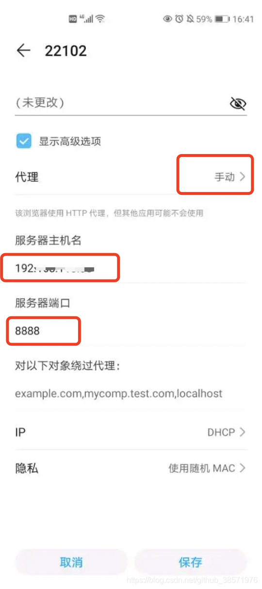 b.在手机端,打开连接的网络,代理设置为手动,服务器地址为pc端的ip地址,端口号为8888,保存。