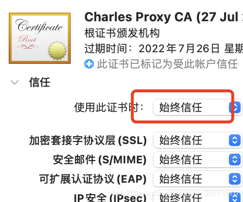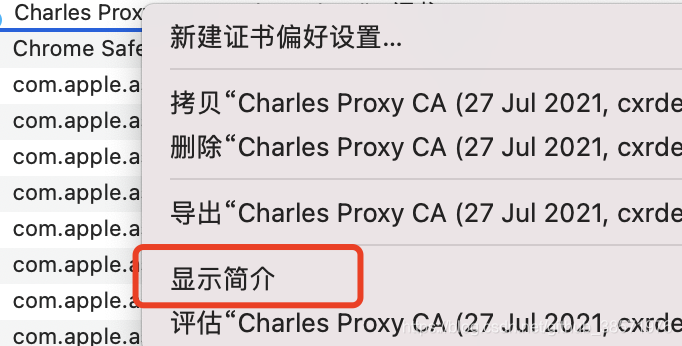 3、右键点击Charles证书,点击显示简介,点击信息,选择始终信任即可。