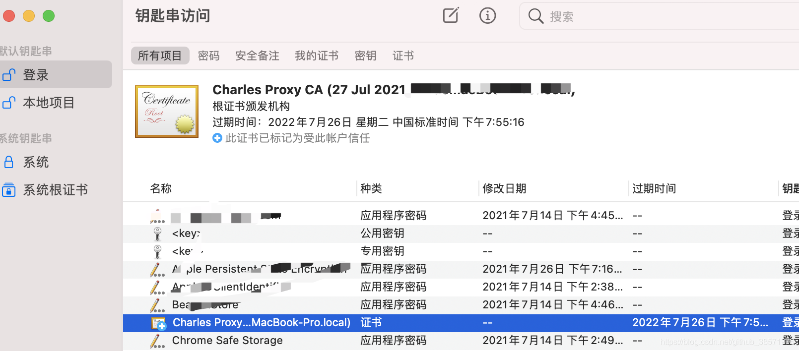 2、会弹出一个框,忘记是啥了,反正继续一下,然后出现钥匙串访问这个,最开始证书里面是找不到Charles的证书的,我理解的是还没下载安装完,过了一会就出现这个了,然后小图标旁边显示的是红色的叉,不是加号,属于未信任状态;