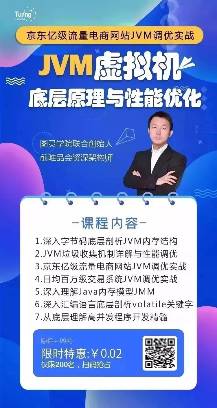 这次,我联合腾讯课堂及图灵学院,为大家精心制作了一套JVM的专题调优实战课程《JVM虚拟机底层原理分析与性能优化》,里面涉及JVM核心原理分析、JVM性能调优实战、BATJ大厂高并发系统线上JVM调优实战。原价99元,本号粉丝特惠,仅需0.02元。(文末有福利)