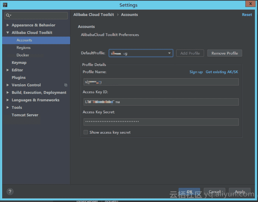 安装完插件之后,点击:顶部菜单Tools --> Alibaba Cloud Toolkit --> Preferences-->左边列表的 Alibaba Cloud Toolkit--> Accounts ,出现如下界面,配置阿里云账号的 AK 和 SK,即可完成首选项配置。(如果是子账号,则填写子账号的 AK 和 SK)