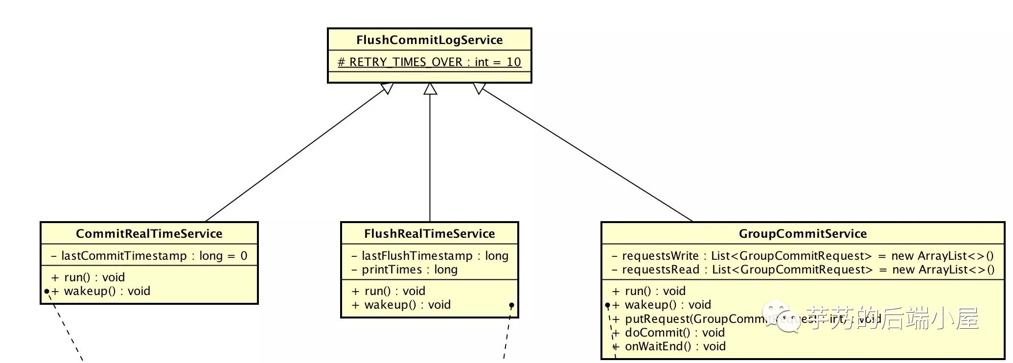 flushCommitLogTimed参数,可以选择每次循环是固定周期还是等待唤醒。默认配置是后者,所以,每次插入消息完成,会去调用commitLogService.wakeup()。第 45 行 :调用