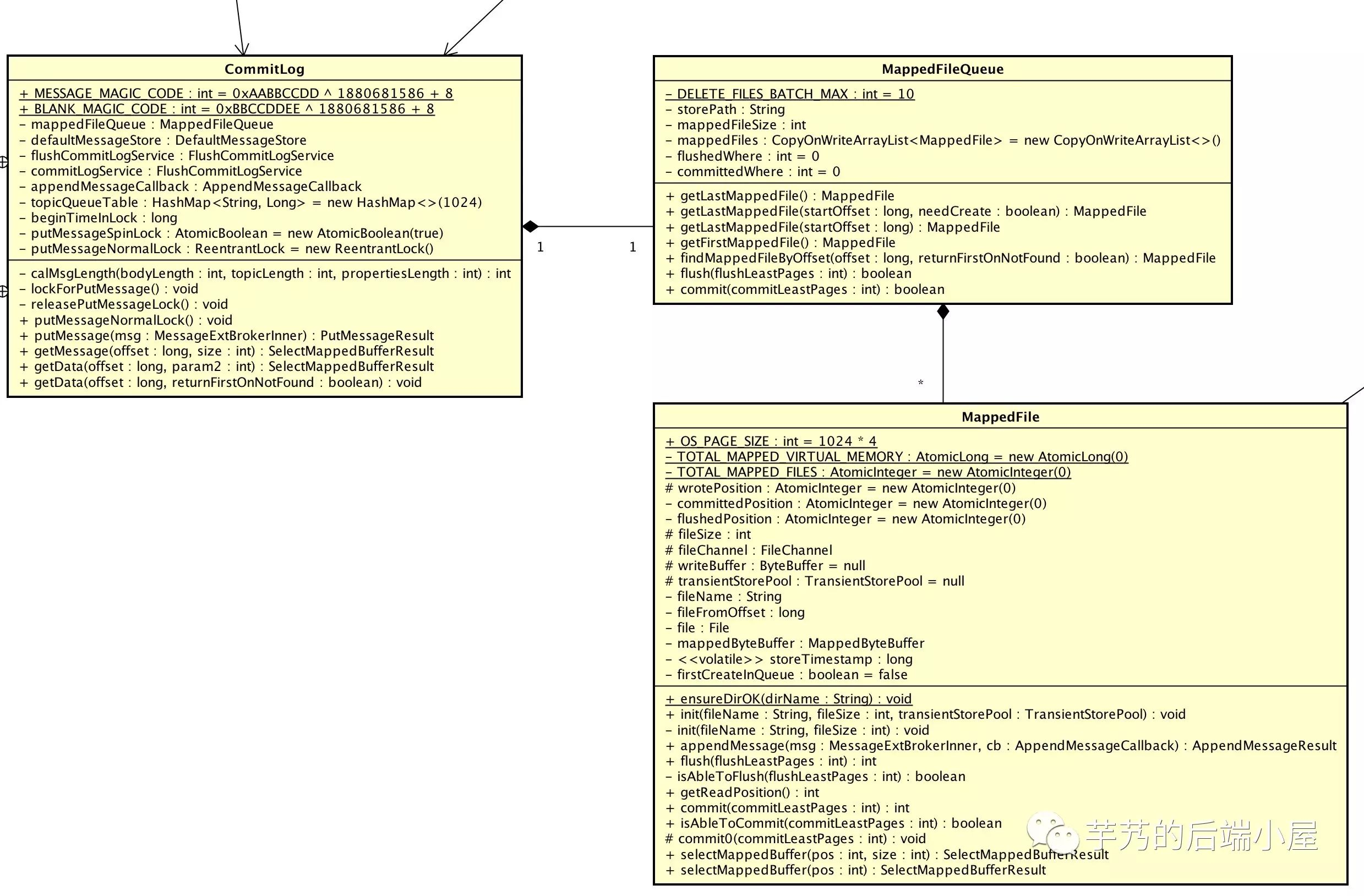CommitLog : MappedFileQueue : MappedFile = 1 : 1 : N。