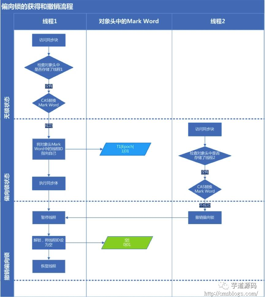 引入偏向锁主要目的是:为了在无多线程竞争的情况下尽量减少不必要的轻量级锁执行路径。上面提到了轻量级锁的加锁解锁操作是需要依赖多次CAS原子指令的。那么偏向锁是如何来减少不必要的CAS操作呢?我们可以查看Mark work的结构就明白了。只需要检查是否为偏向锁、锁标识为以及ThreadID即可,处理流程如下: