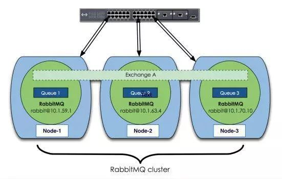 上面图中采用三个节点组成了一个RabbitMQ的集群,Exchange A(交换器,对于RabbitMQ基础概念不太明白的童鞋可以看下基础概念)的元数据信息在所有节点上是一致的,而Queue(存放消息的队列)的完整数据则只会存在于它所创建的那个节点上。,其他节点只知道这个queue的metadata信息和一个指向queue的owner node的指针。