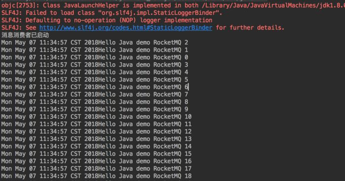 按前述步骤 启动 Name Server 和 Broker,接着运行消息生产者和消息消费者程序,简化起见我们用两个单元测试类模拟这两个程序: