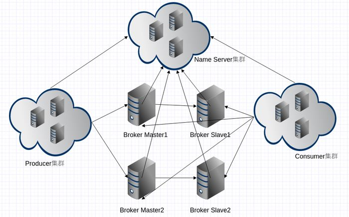 下面是一张 RocketMQ 的部署结构图,里面涉及了 RocketMQ 核心的四大组件:Name Server、Broker、Producer、Consumer ,每个组件都可以部署成集群模式进行水平扩展。