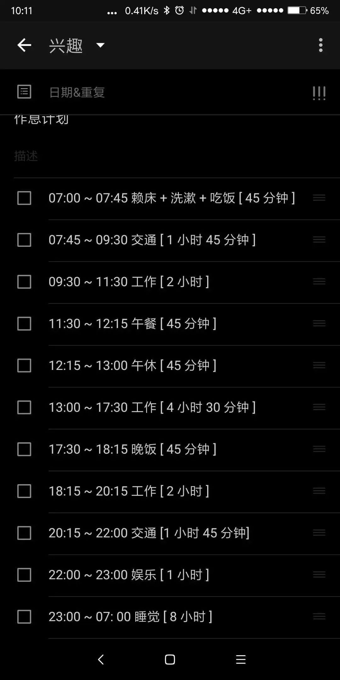 看完这本书后,我们就可以规划自己每天的时间安排。有一点要注意,工作日和周末要分开做时间计划。例如,如下是一个计划示例: