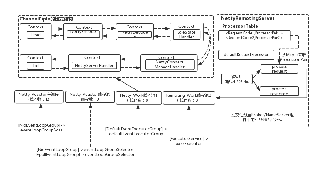 这里需要说明的是,Worker线程拿到网络数据后,就交给Netty的ChannelPipeline(其采用责任链设计模式),从Head到Tail的一个个Handler执行下去,这些 Handler是在创建NettyRemotingServer实例时候指定的。NettyEncoder和NettyDecoder 负责网络传输数据和 RemotingCommand 之间的编解码。NettyServerHandler 拿到解码得到的 RemotingCommand 后,根据 RemotingCommand.type 来判断是 request 还是 response来进行相应处理,根据业务请求码封装成不同的task任务后,提交给对应的业务processor处理线程池处理。