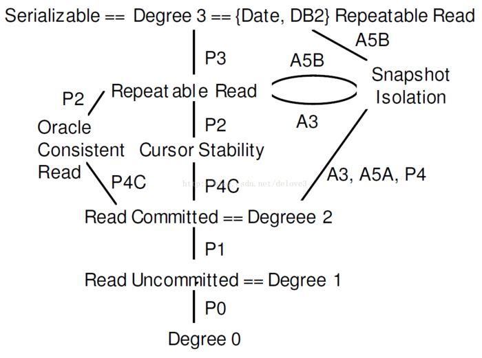 jim gray曾经有一篇论文讨论不同机制实现的数据库隔离级别的不同表现,并将隔离级别扩展到7个。见下图: