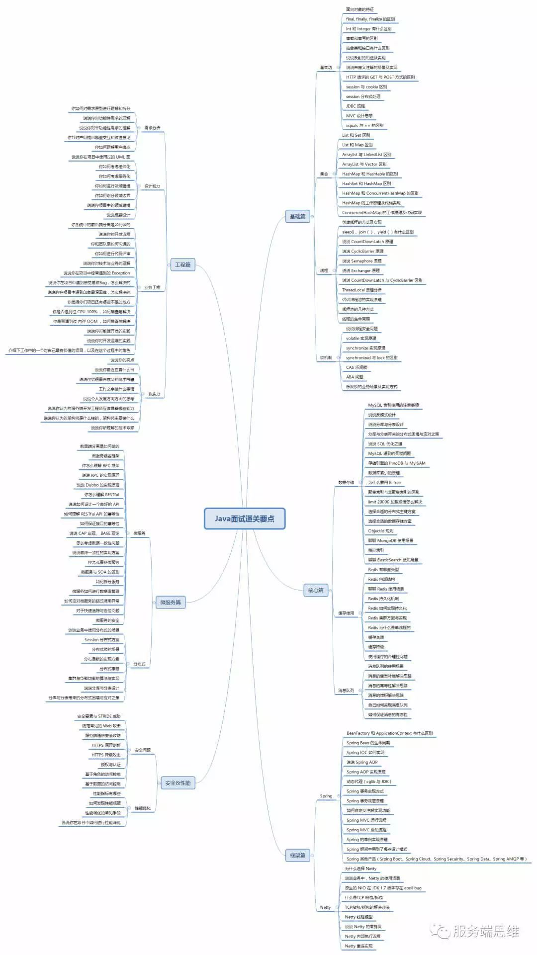 本文结合面试经验,整理了Java服务端核心技术知识清单。涵盖基础篇(基本功、集合、线程、锁机制)、核心篇(数据存储、缓存使用、消息队列)、框架篇(Spring、Netty)、微服务篇(微服务、分布式)等内容,还涉及安全性能、工程能力及HR面试要点。