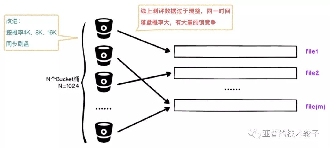 这里就遇到一个问题,同样配置的阿里云机器测试随机数据同步写入性能是非常高的,但是线上的评测数据都是58字节,数据过于规整导致同一时间落盘的概率很大,出现了大量的锁竞争。所以这里做了一个小的改进:按概率随机4K、8K、16K进行落盘,写性能虽有一定提升,但是效果也是不太理想,于是采用了第二种思路异步刷盘。