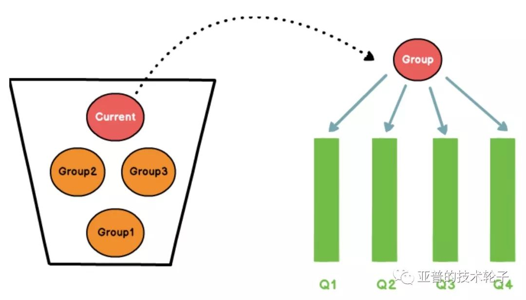 当Group达到M个后便形成一个固定分组。相同队列会在Group内进行合并,新的队列数据将继续分配Group接收。