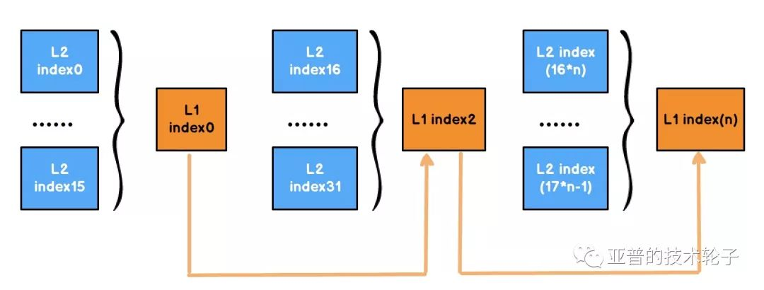 为了加快查询速度,在L2基础上建立L1一级索引,每16个L2建立一个L1,L1按照时间先后顺序存放。L1和L2的组织关系如下: