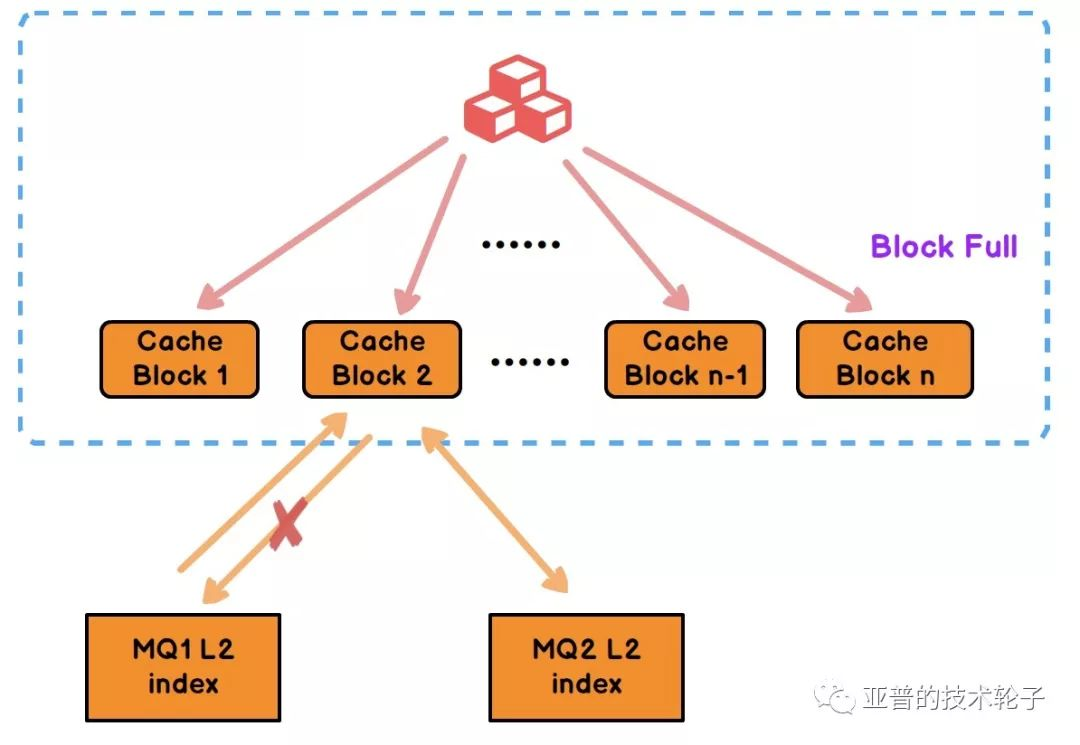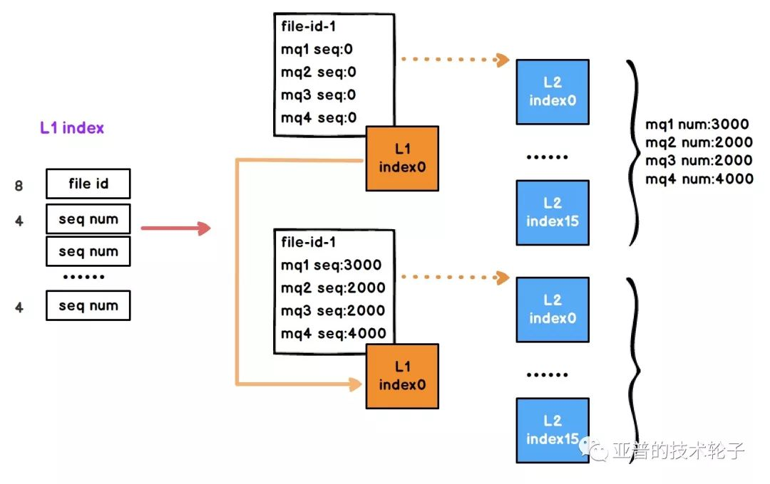 L1索引的结构非常简单,file id对应消息存储的文件id,以及16个Block块中每个队列消息的起始序列号seq num。例如MQ1从序列号1000开始,MQ2从序列号2000开始等等。