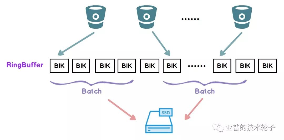 不必等待单个队列满而进行批量刷盘,减少内存占用,更多的内存可支持更多的队列。