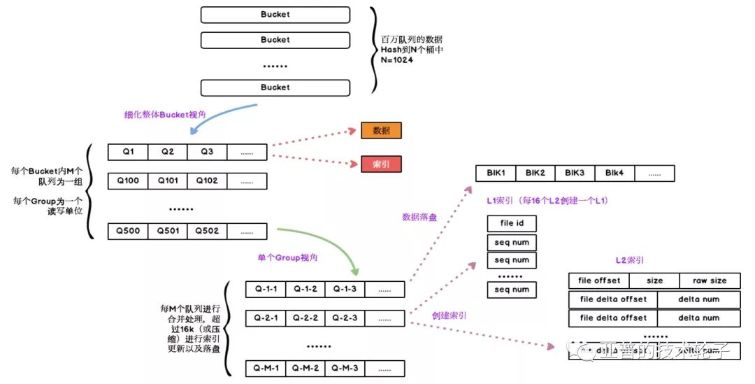 每个Bucket中分为多个Group,每个Group为一个读写单位,对队列进行merge,同时更新索引和数据文件。