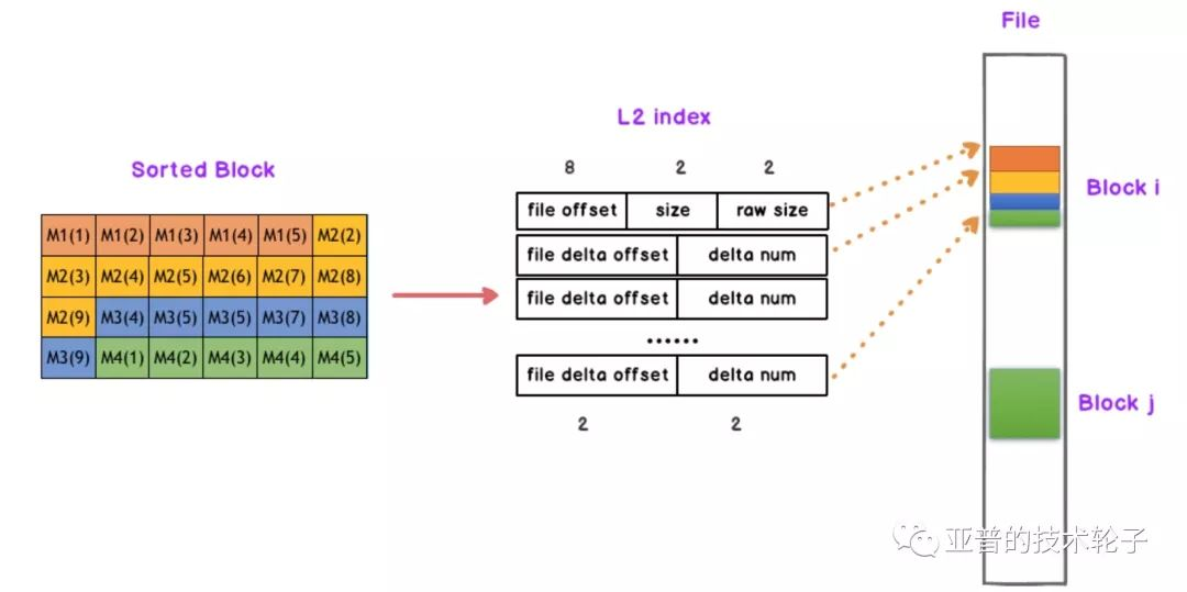 L2二级索引与数据存储的位置息息相关,见下图。为每个排序后的Block块建立一个L2索引,L2索引的结构分为文件偏移(file offset),数据压缩大小(size),原始大小(raw size),因为我们是多个队列merge,然后接下来是每个队列相对于起始位置的delta offset以及消息数量。