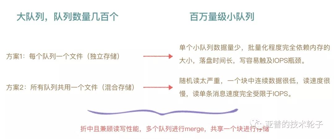 | Kafka独立存储 | 单个小队列数据量少,批量化程度完全取决于内存大小,落盘时间长,写数据容易触发IOPS瓶颈 |