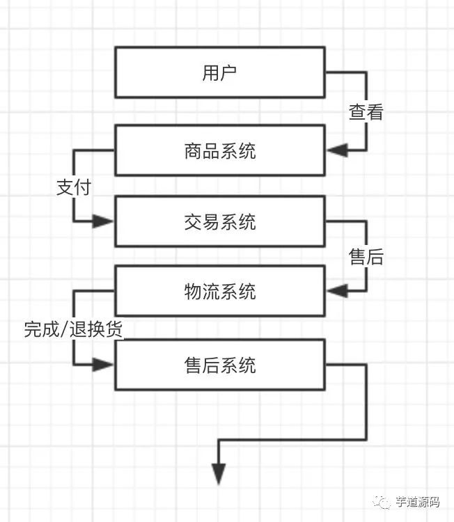 商品系统->交易系统->订单系统->物流系统->售后系统