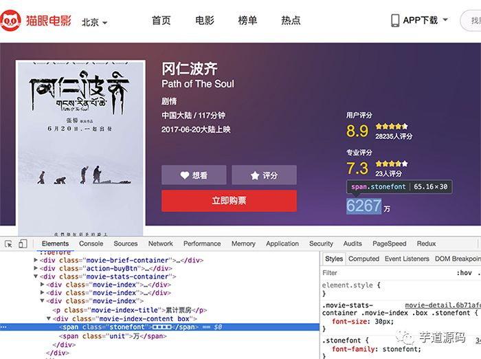 猫眼电影里,对于票房数据,展示的并不是纯粹的数字。 页面使用了font-face定义了字符集,并通过unicode去映射展示。也就是说,除去图像识别,必须同时爬取字符集,才能识别出数字。