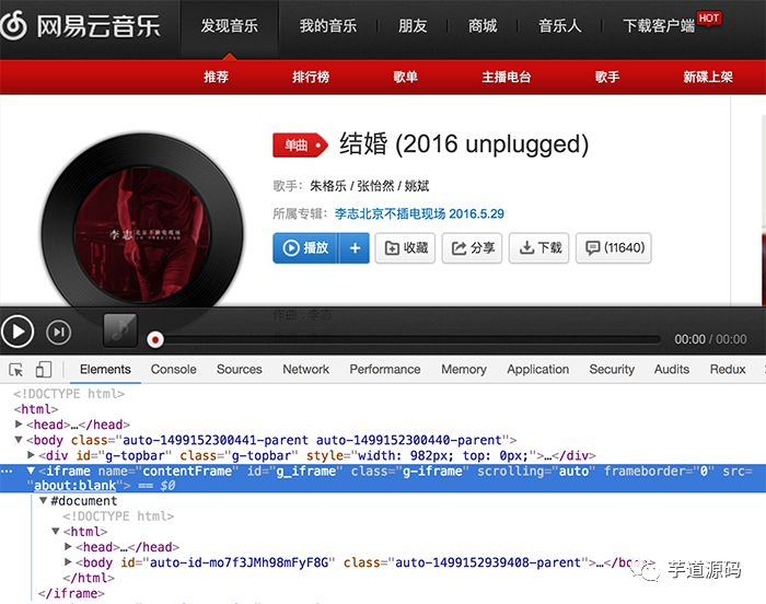 网易云音乐页面一打开,html源码里几乎只有一个iframe,并且它的src是空白的:about:blank。接着js开始运行,把整个页面的框架异步塞到了iframe里面…