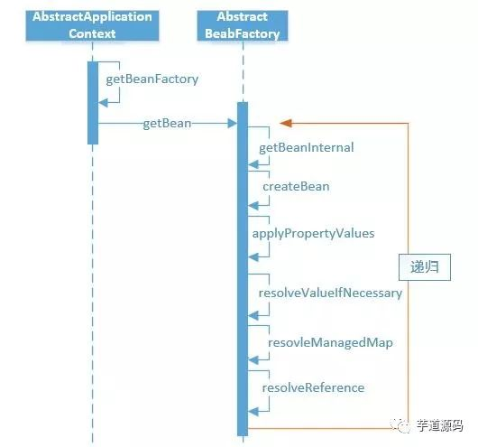 假设 : 当 Bean_A 依赖着 Bean_B,而这个 Bean_A 在加载的时候,其配置的 ref = “Bean_B” 在解析的时候只是一个占位符,被放入了 Bean_A 的属性集合中,当调用 getBean 时,需要真正 Bean_B 注入到 Bean_A 内部时,就需要从容器中获取这个 Bean_B,因此产生了递归。