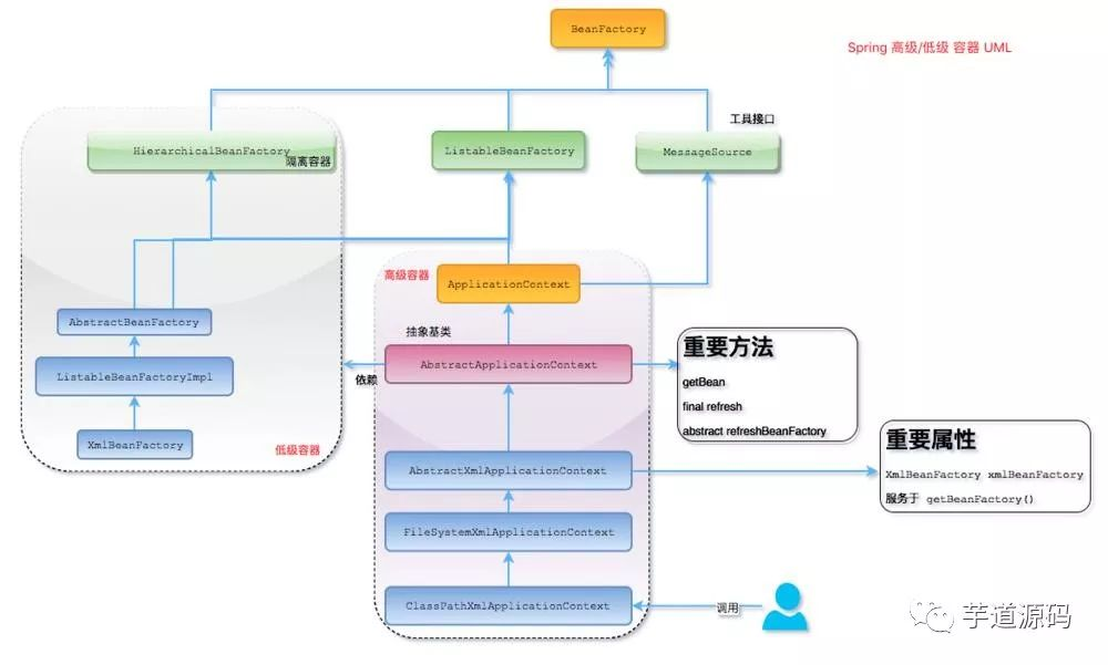 看下面的隶属 ApplicationContext 粉红色的 “高级容器”,依赖着 “低级容器”,这里说的是依赖,不是继承哦。他依赖着 “低级容器” 的 getBean 功能。而高级容器有更多的功能:支持不同的信息源头,可以访问文件资源,支持应用事件(Observer 模式)。