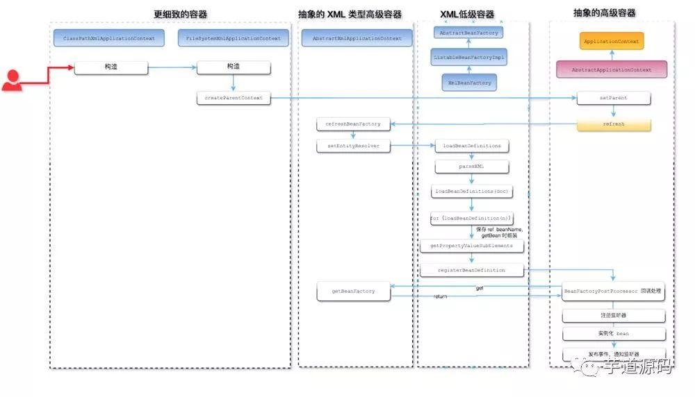 好,解释了低级容器和高级容器,我们可以看看一个 IoC 启动过程是什么样子的。说白了,就是 ClassPathXmlApplicationContext 这个类,在启动时,都做了啥。(由于我这是 interface21 的代码,肯定和你的 Spring 4.x 系列不同)。