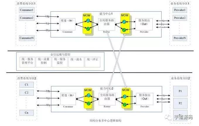 为了实现服务访问地址透明,每个中心的In容器(如有必要)既可以发布本中心部署的服务API,也可以发布其他中心部署的服务的API,所以无论消费者从任何一个中心的渠道接入,都可以透明的访问全局所有的服务。